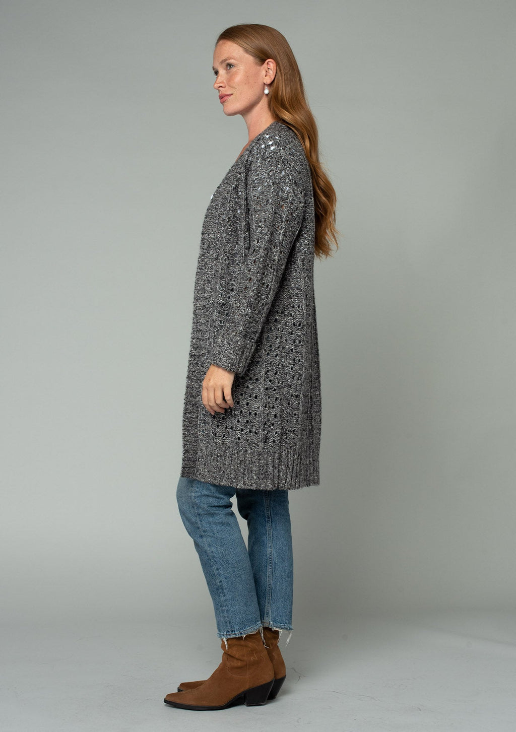 The perfect transitional fall cardigan. This lightweight style features long sleeves, an open front, and ribbed wrist cuffs. The cool open knit offers airflow for late summer evenings and early fall days.