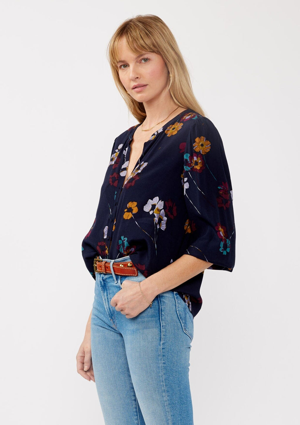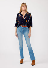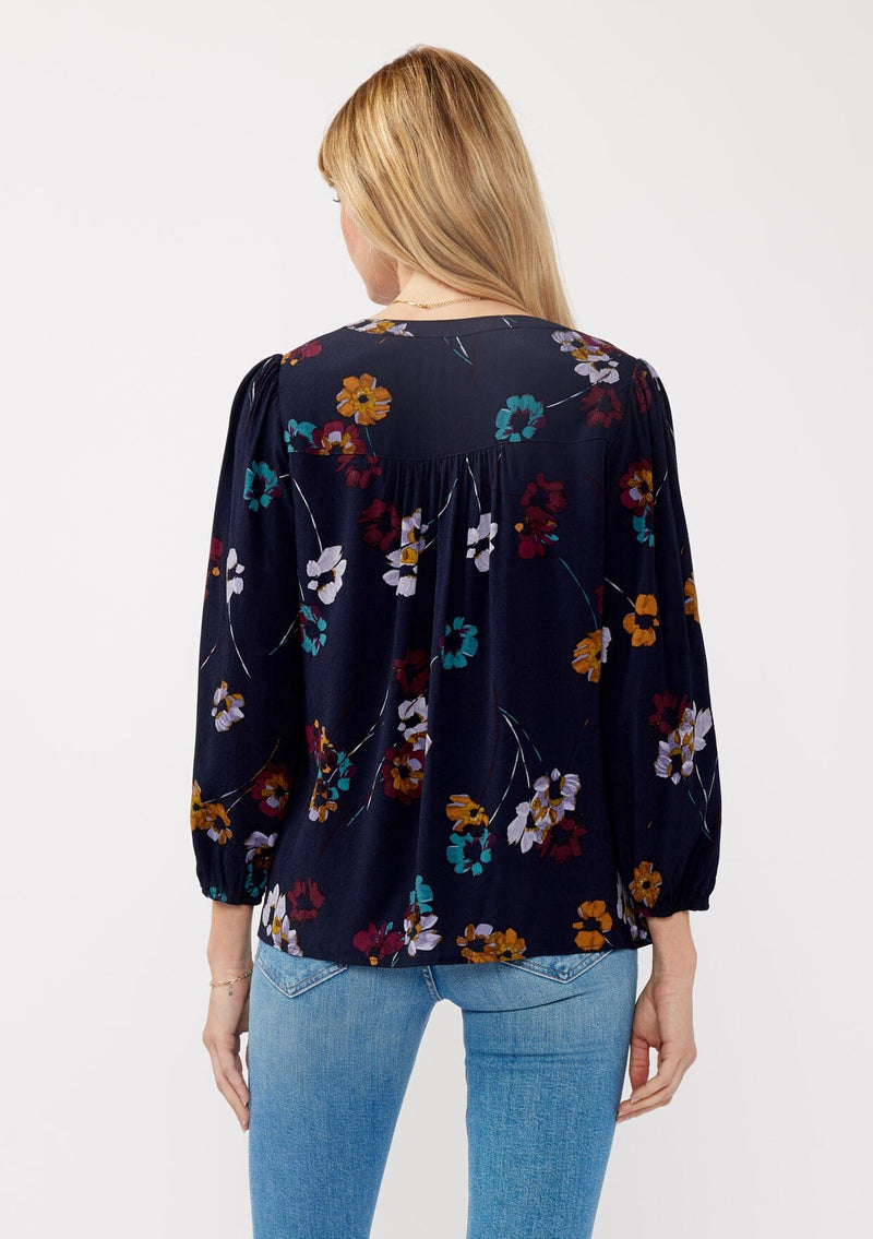 An elevated take on your everyday bohemian blouse. Designed in an elegant navy blue floral print, this timeless blouse features a self-covered button front, a split v-neckline, and a perfectly relaxed fit.