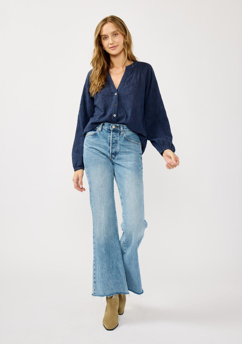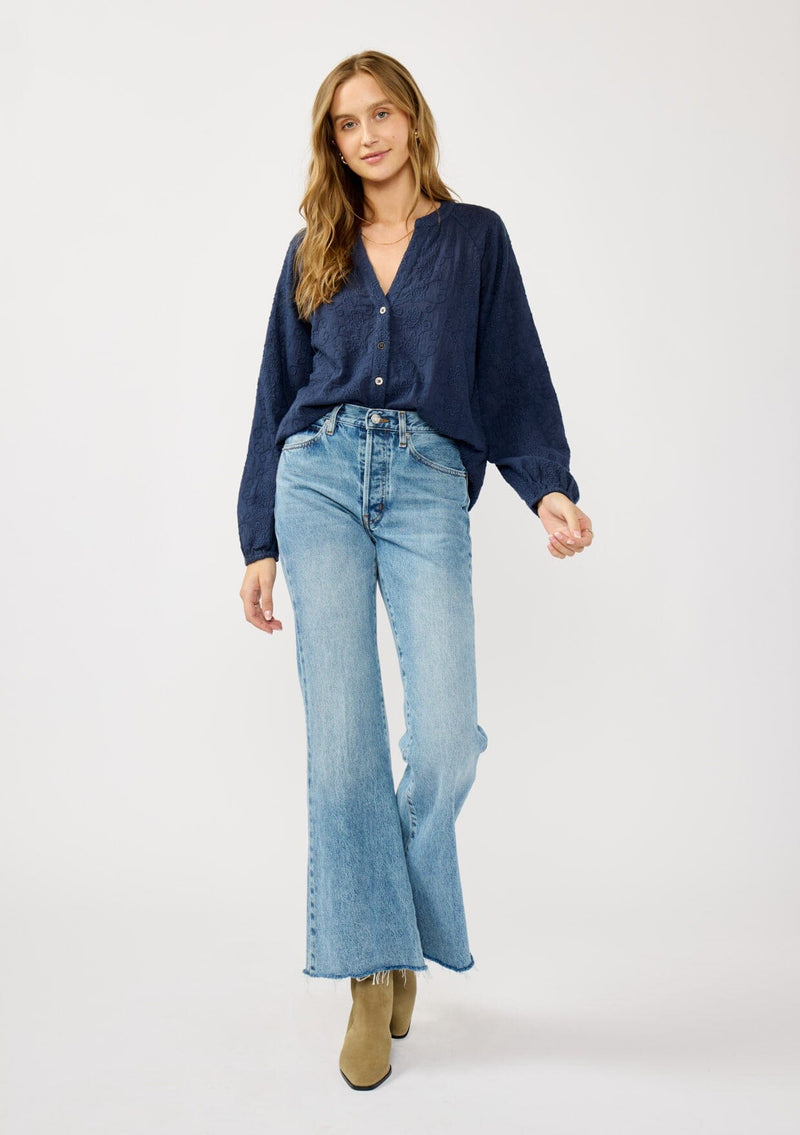 This embroidered button-up blouse adds a modern twist to a timeless classic. Designed with a split v-neckline and a traditional button front, it strikes the perfect balance between tailored and effortless. From busy workdays to weekend brunch, it styles seamlessly with your favorite vintage denim for a fall-ready look.