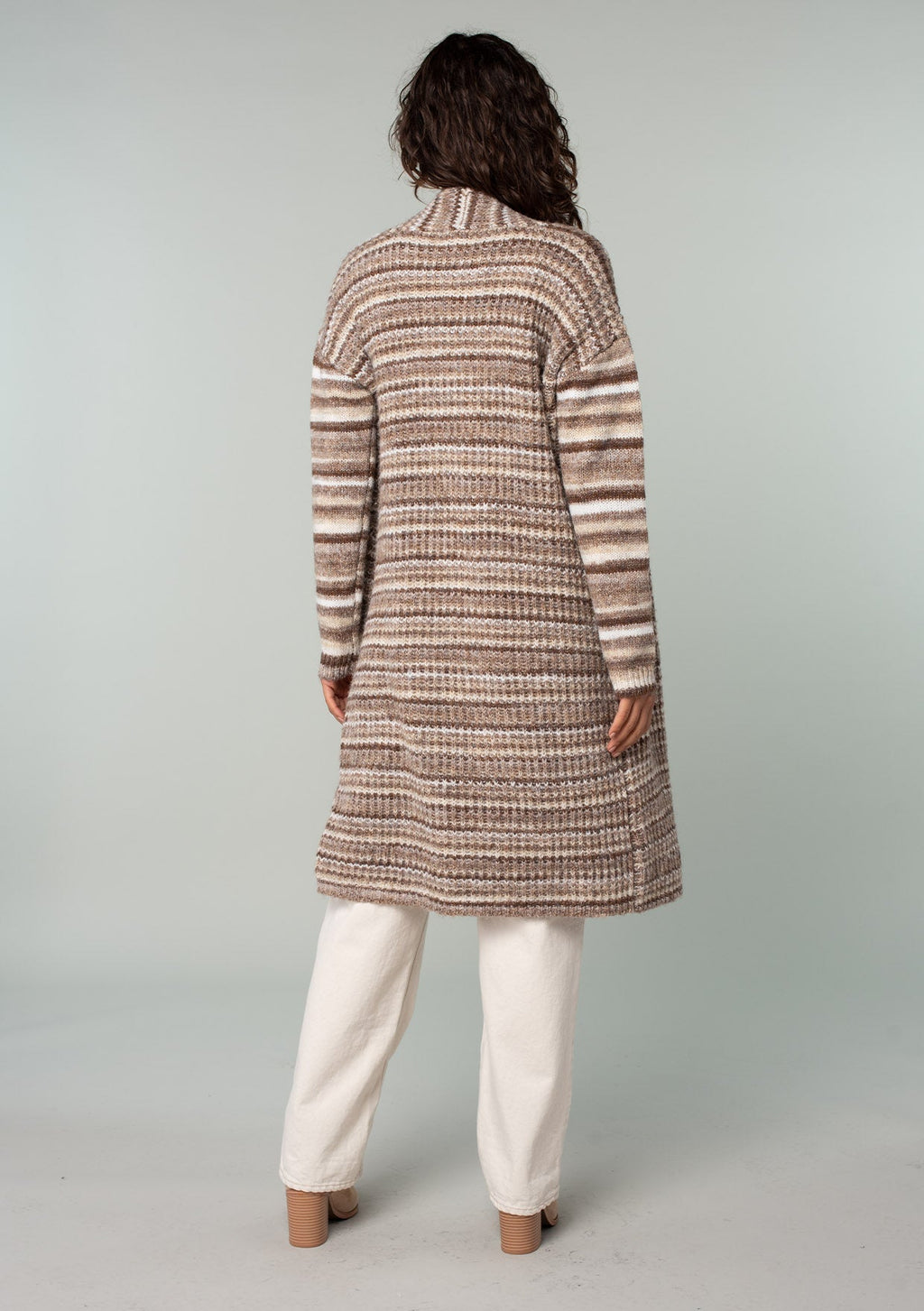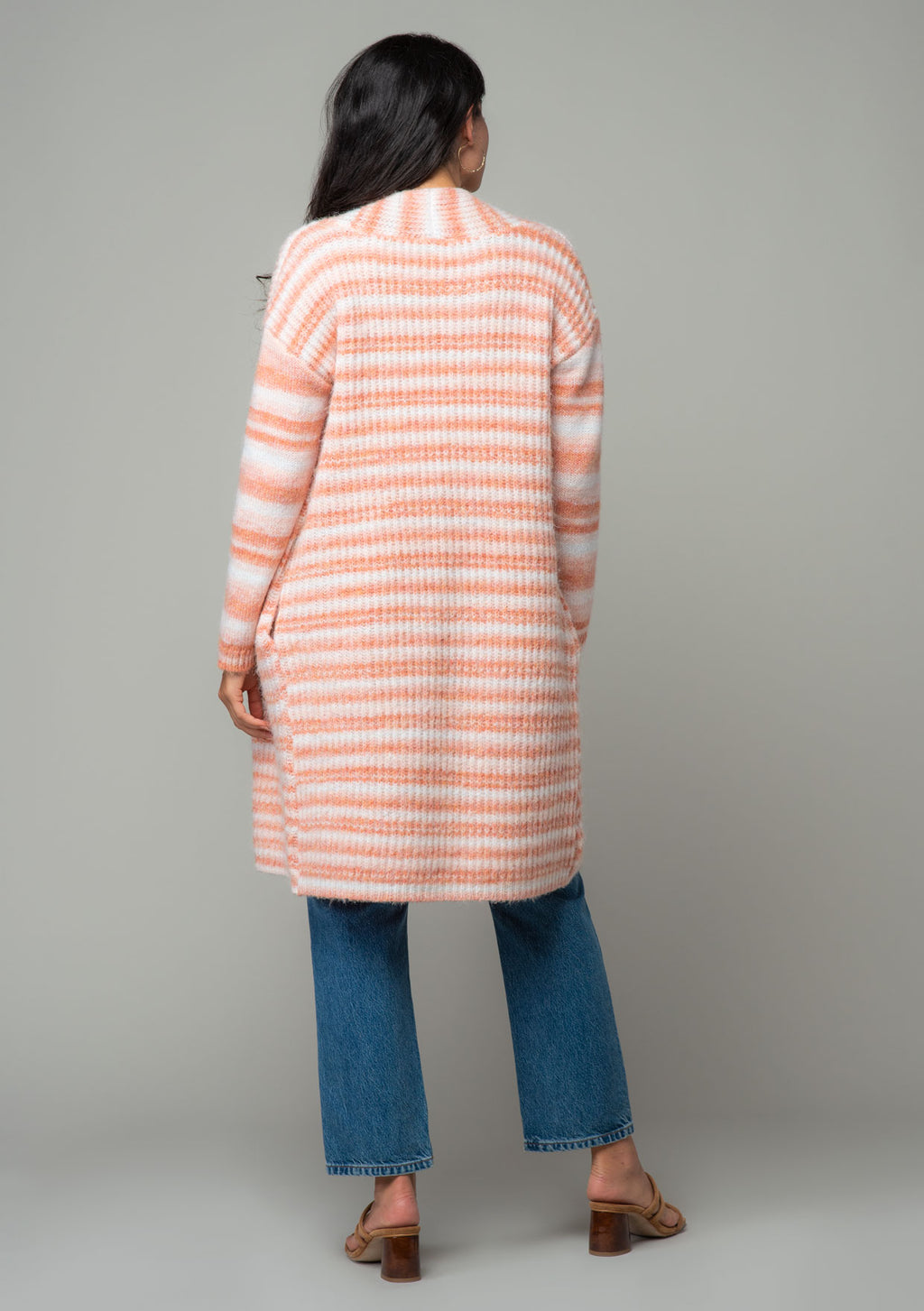 A textured ombre striped knit cardigan with side pockets.