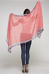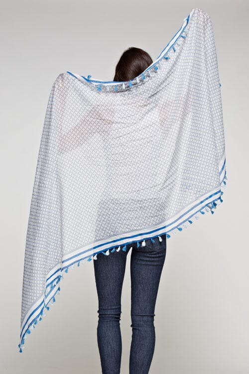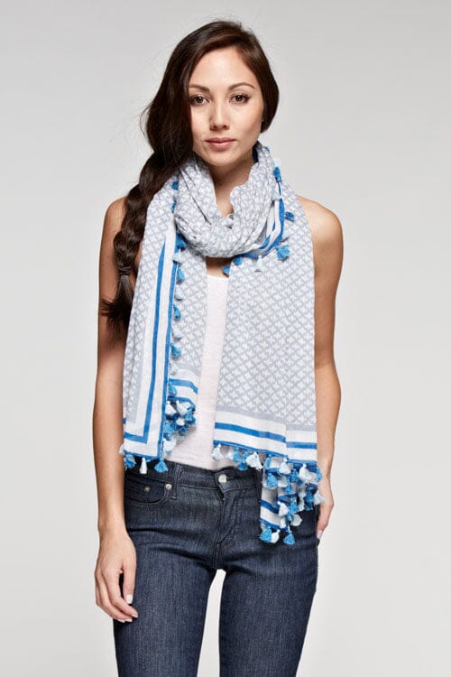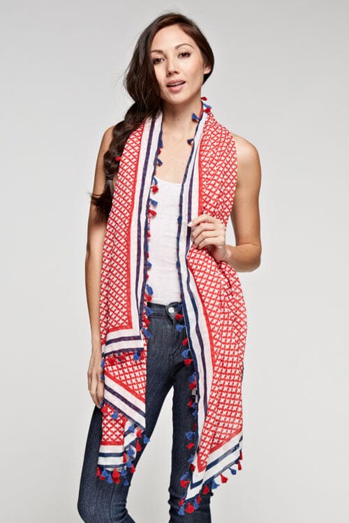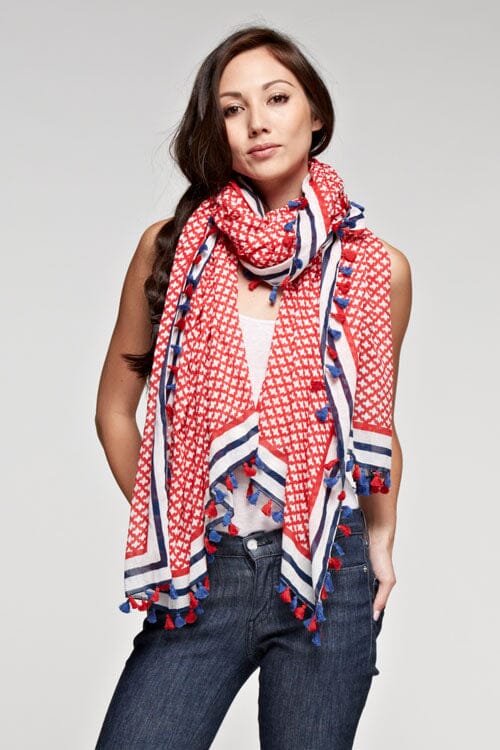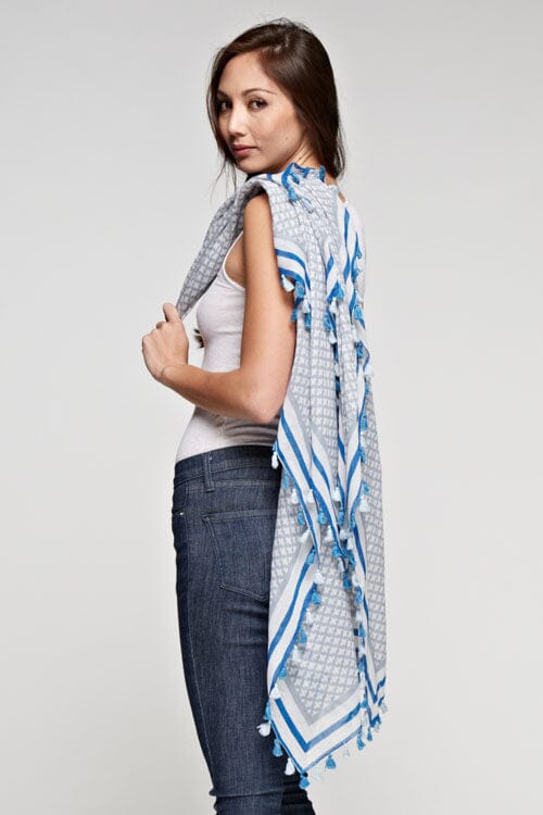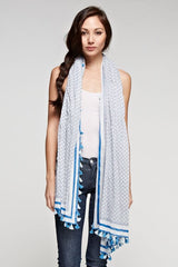 Elevate your look with this rectangular sheer cotton scarf, featuring a vibrant tile border print and playful tassel trim. Perfect for accessorizing and elevating any casual look when you want effortless style with minimal effort.