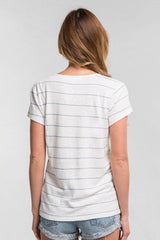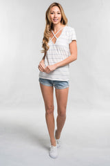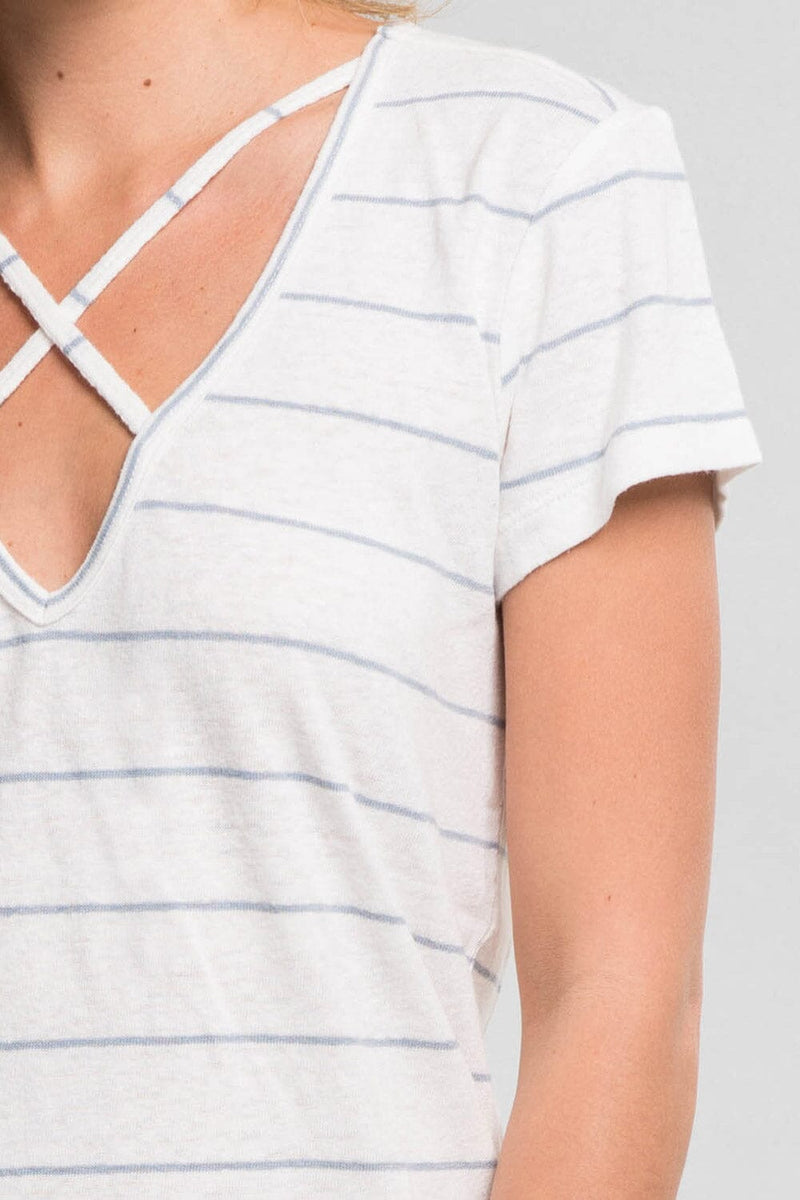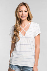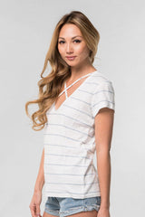 Short sleeve, criss-cross neck, relaxed fit, striped tee. You'll wear this super soft, comfy tee all year long.