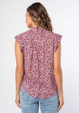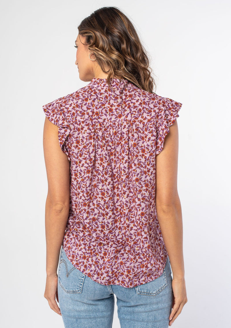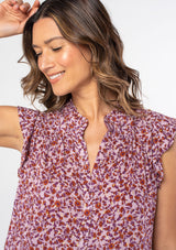 A best-seller for a reason, this effortless bohemian top is designed in a purple floral print with gold metallic clip dot details throughout. Featuring a self-covered button front, a flirty ruffled neckline, and short flutter sleeves.