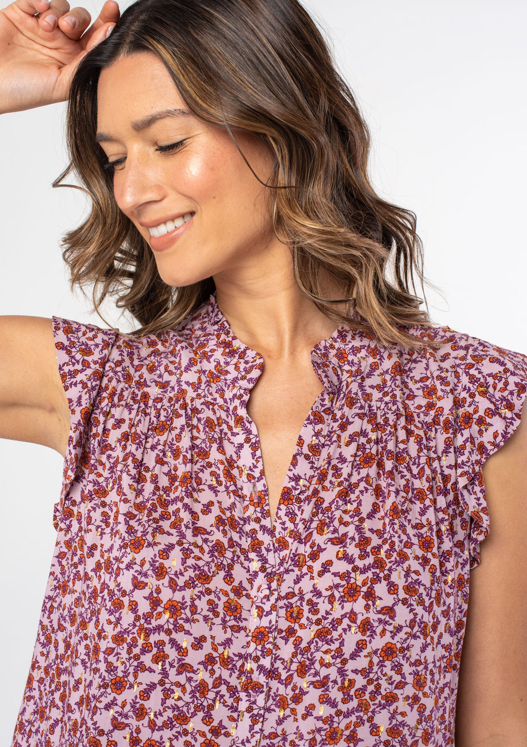 A classic purple floral print flutter sleeve top with gold lurex clip dot details throughout.