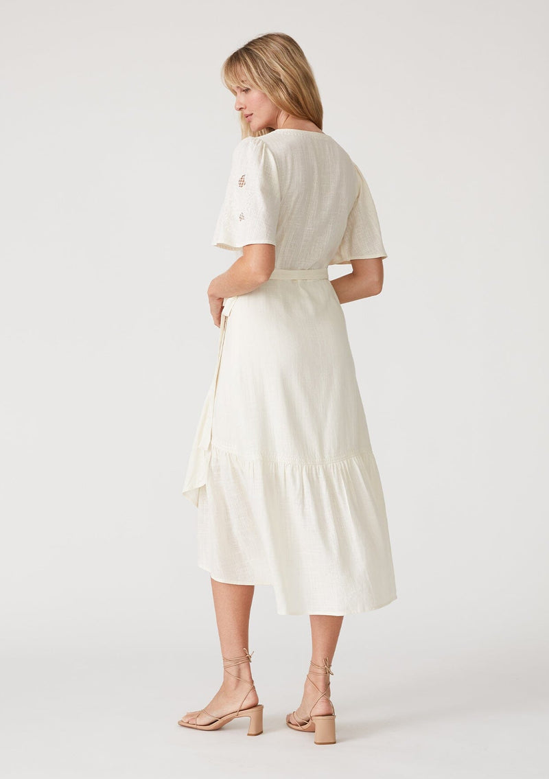 A charming addition to your special occasion wardrobe, our effortlessly sweet wrap dress features short flutter sleeves with delicately embroidered detail and an adjustable side tie waist closure. The tiered skirt adds movement and swing to this classic silhouette.