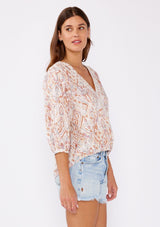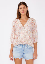Crafted from a structured yet breathable cotton material, this surplice front blouse is designed in a beautiful pink ikat print, making it your ideal top for summer. Featuring flattering 3/4 length sleeves and a pretty crochet trim for a touch of bohemian charm. Pair it with your favorite cut off denim shorts and a pair of flat sandals for an elevated yet casual style.