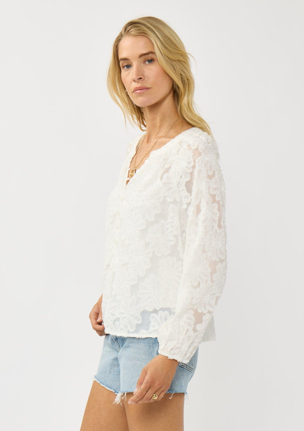 An elevated sheer blouse featuring delicate clipped floral detailing for subtle texture. Designed with a split v-neckline and button-front closure for a clean, modern finish. Style it with denim shorts for an effortlessly chic look that’s both relaxed and stylish for daytime outings.