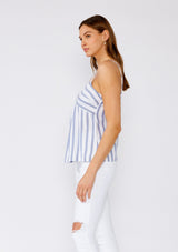 A fresh take on a spring staple. Our timeless camisole tank top is designed in a blue and white stripe with a delicate metallic gold thread detail. Featuring adjustable spaghetti straps, a flattering v-neckline, and a subtle flared silhouette.