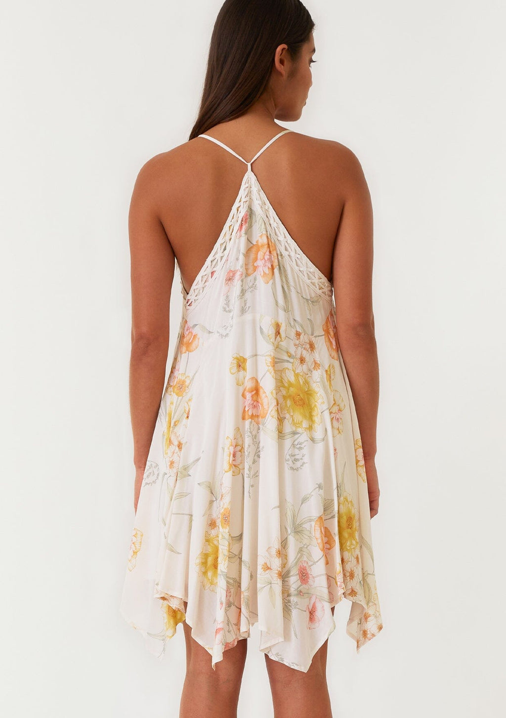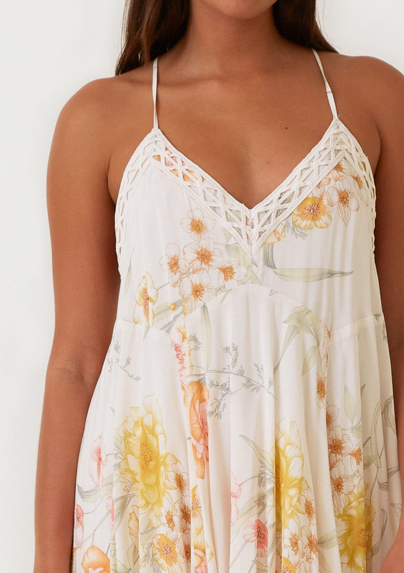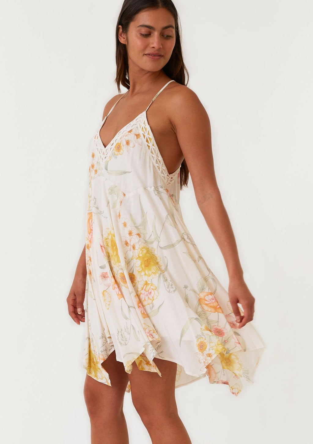 Embrace rising temperatures with our versatile bohemian mini dress. Designed in a vintage-inspired floral print, this dreamy style will take you from the beach to a night out. Featuring pretty lace trim, ultra-thin spaghetti straps, and a swingy asymmetric hemline.