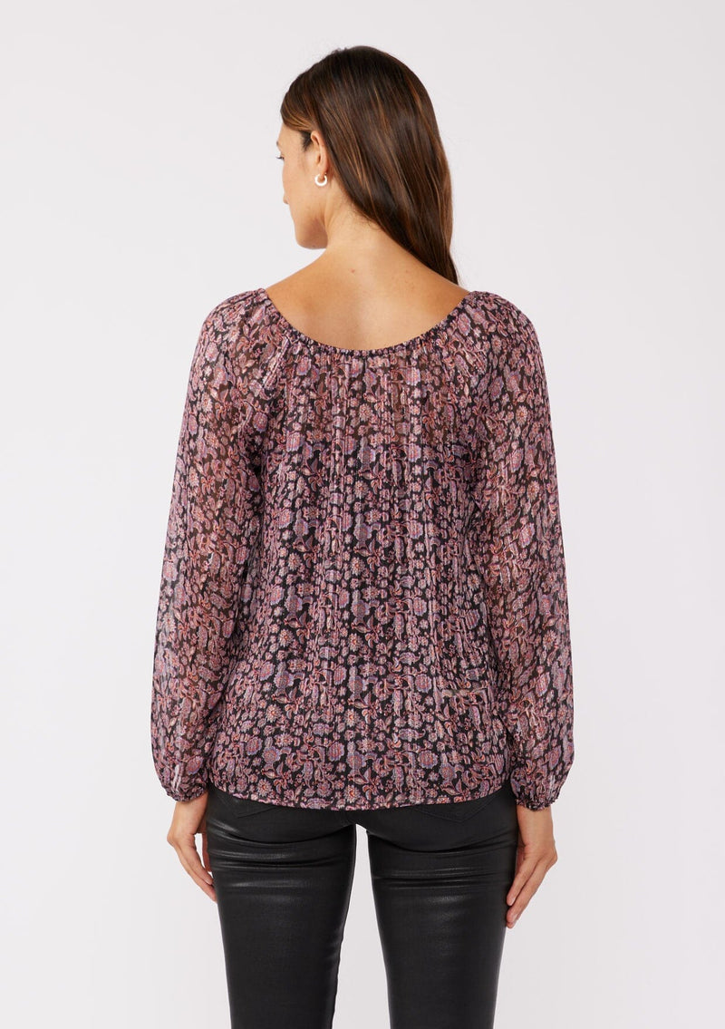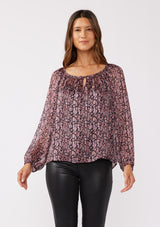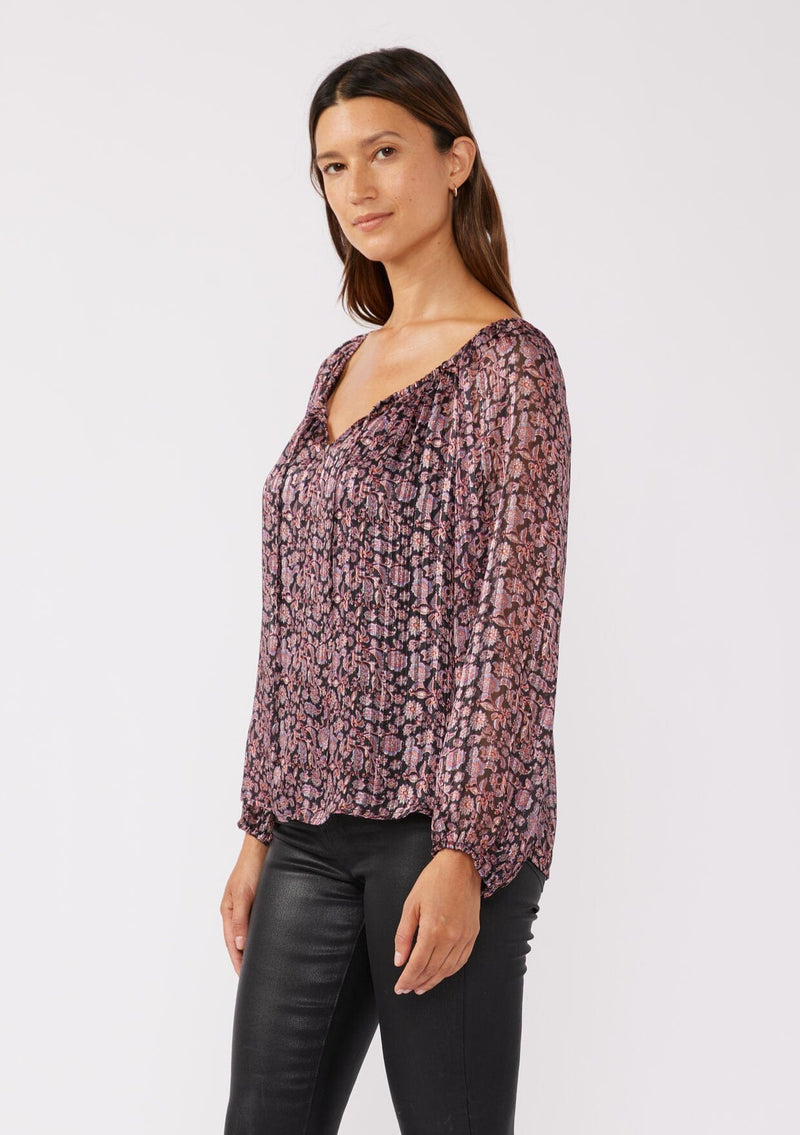 A classic floral bohemian blouse with light-catching lurex stripes.