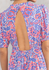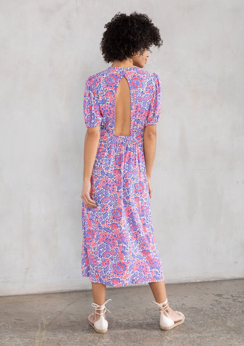 Full of vintage-inspired details, this charming bohemian midi dress will add an instant refresh to your closet. Designed in a retro paisley print, featuring short puff sleeves, an ultra-pretty ruffled-trimmed surplice v-neckline, and a flirty back keyhole detail with self-covered button closure at the neck.