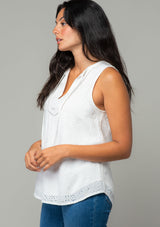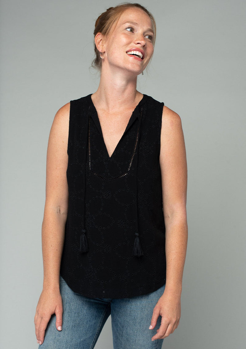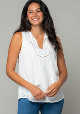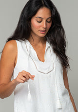 An effortless throw-on-and-go top for all summer long. Our timeless bohemian tank top features a split v-neckline with tassel ties and embroidered eyelet detail throughout.