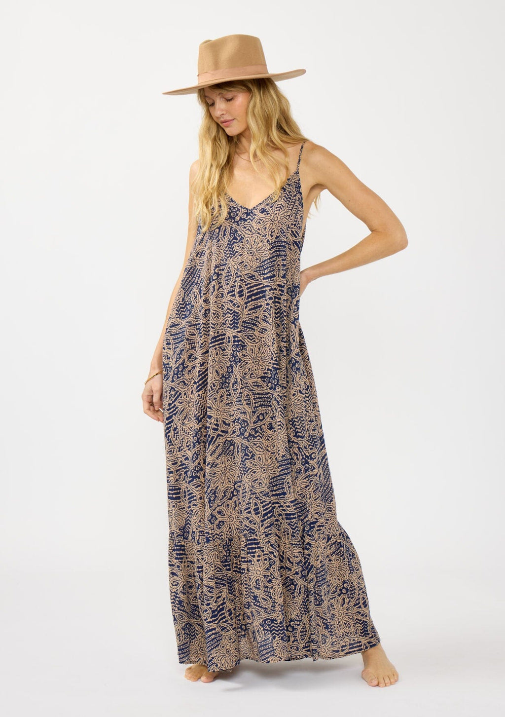 ![[Color: Navy/Natural] A front facing image of a blonde model wearing a flowy bohemian floral print maxi dress with adjustable spaghetti straps, a v neckline, and side pockets.](http://www.shoplovestitch.com/cdn/shop/files/Lovestitch_01192026_466_160x.jpg?v=1770795494)