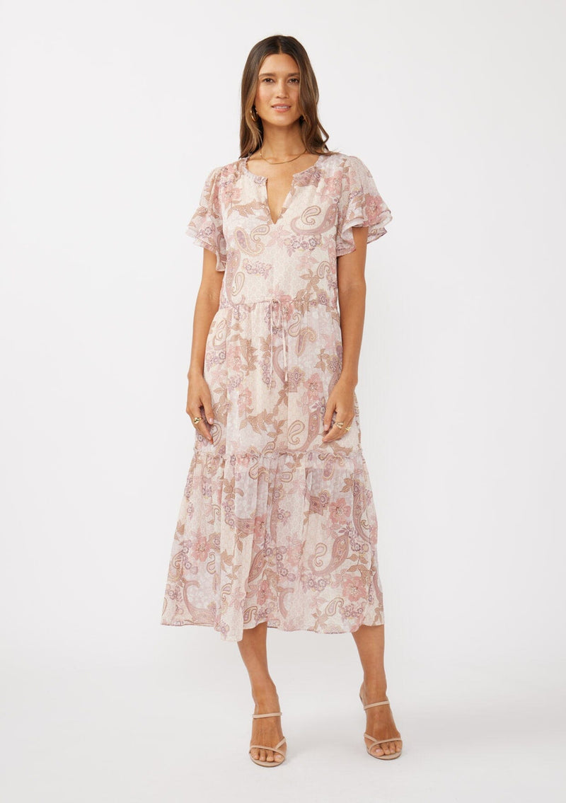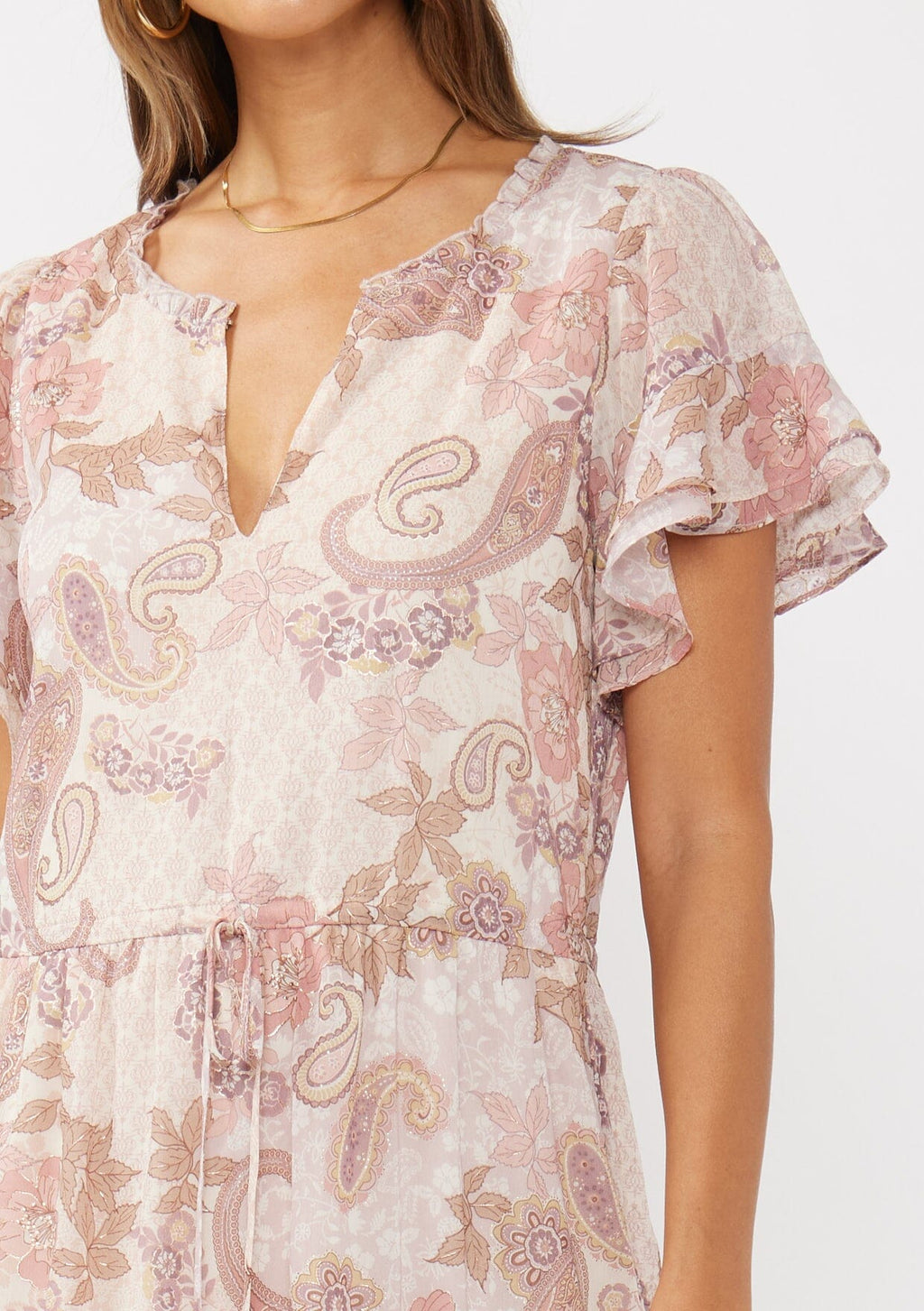 What boho dreams are made of. This paisley and floral mix dress embodies modern femininity with effortless boho charm, featuring flutter sleeves, an adjustable drawstring waist, and a flowy tiered skirt. Delicate gold foil accents catch the light beautifully, adding a touch of shimmer to this breezy silhouette. Perfect for any dreamy dinner or special occasion.