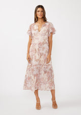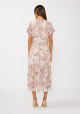 A flowy midi dress with a pink paisley floral print and gold foil accents.