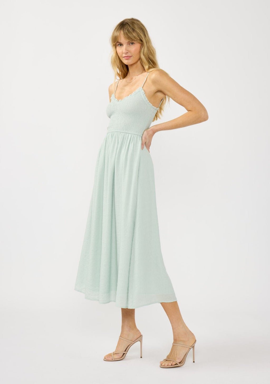 ![[Color: Mint] A side facing image of a blonde model wearing a mint green midi dress with a smocked bust, spaghetti straps, and ruffle trim details.](http://www.shoplovestitch.com/cdn/shop/files/Lovestitch_01192026_452_160x.jpg?v=1770251254)