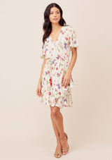 An adorable white mini dress with precious, ultra girly watercolor floral print! The short flutter sleeves and ruffled hemline add a flirty vibe. Featuring a wrap front with hook and eye closure and cute tassel tie belted waist. A darling and feminine bohemian take on summer dressing.