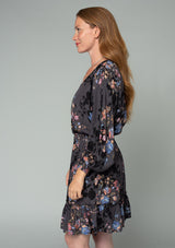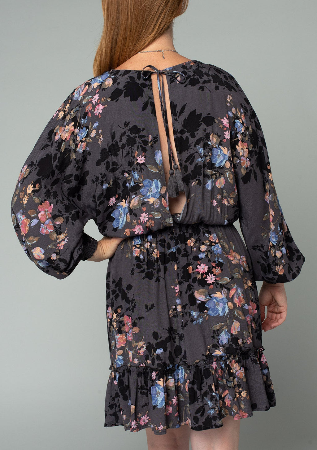 A classic flowy bohemian mini dress in a dark grey and blue floral print.
