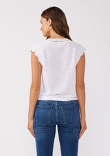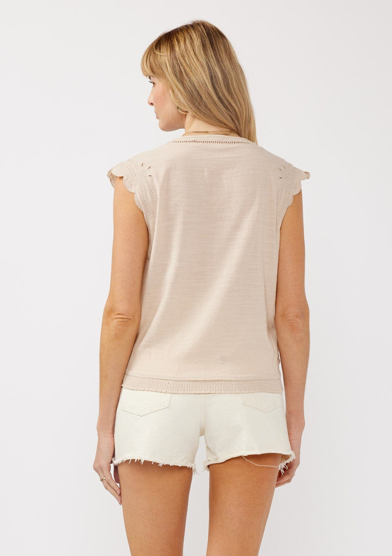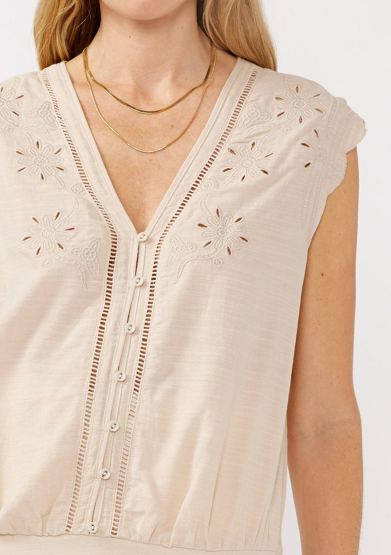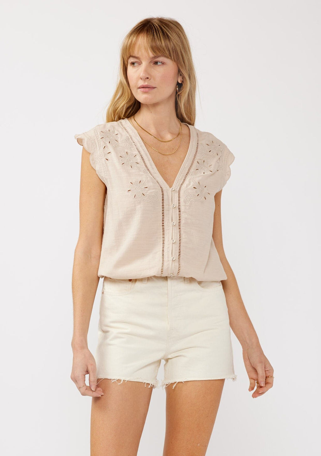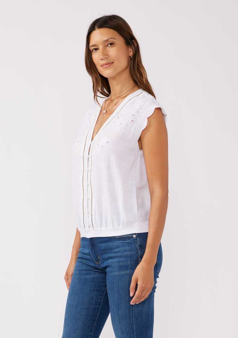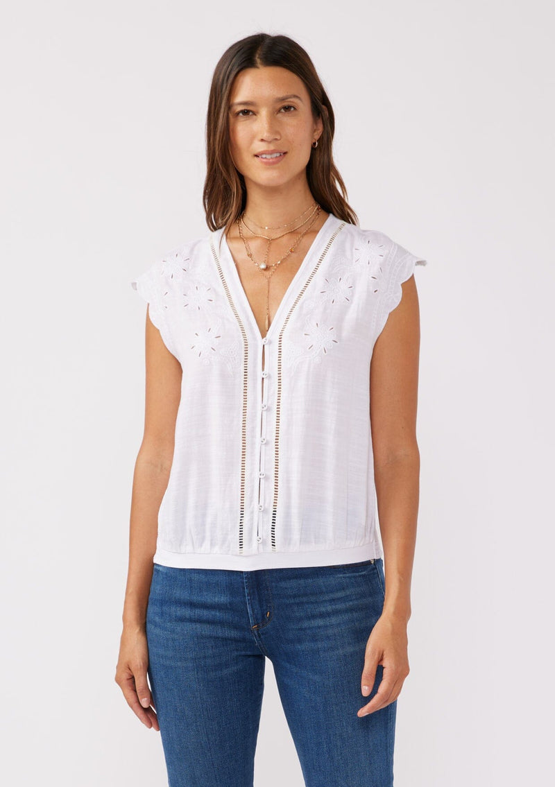 Delicate embroidered details bring a bohemian charm to this elevated cap-sleeve blouse. With a flattering, form-fitting hem and airy cap sleeves, this effortless style is a must-have essential. Completed with self-covered buttons and a delicate lattice trim that adds a soft, feminine touch. Pair it with denim for an easy, chic look.