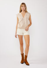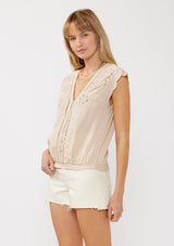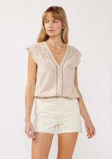 ![[Color: Buff] A detail image of a blonde model wearing a taupe rayon and cotton blend top with an embroidered floral cutout design. This casual spring top features a v neckline, button front, short dolman sleeves, and a hip hugging elastic hem at the back.](http://www.shoplovestitch.com/cdn/shop/files/I-15424W-PZA_BUFF_DETAIL_160x.jpg?v=1748478608)