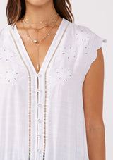 ![[Color: White] A detail shot of a brunette model wearing a rayon and cotton blend top with an embroidered floral cutout design. This casual white top features a v neckline, button front, short dolman sleeves, and a hip hugging elastic hem at the back.](http://www.shoplovestitch.com/cdn/shop/files/I-15424W-PZA_WHITE-D_160x.jpg?v=1748478608)