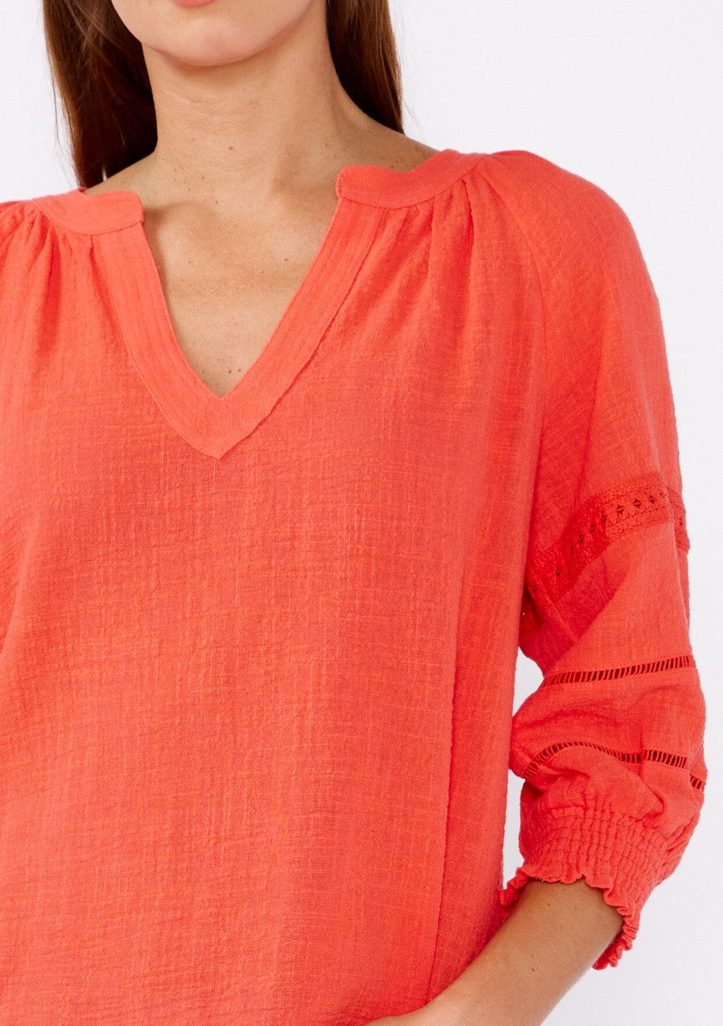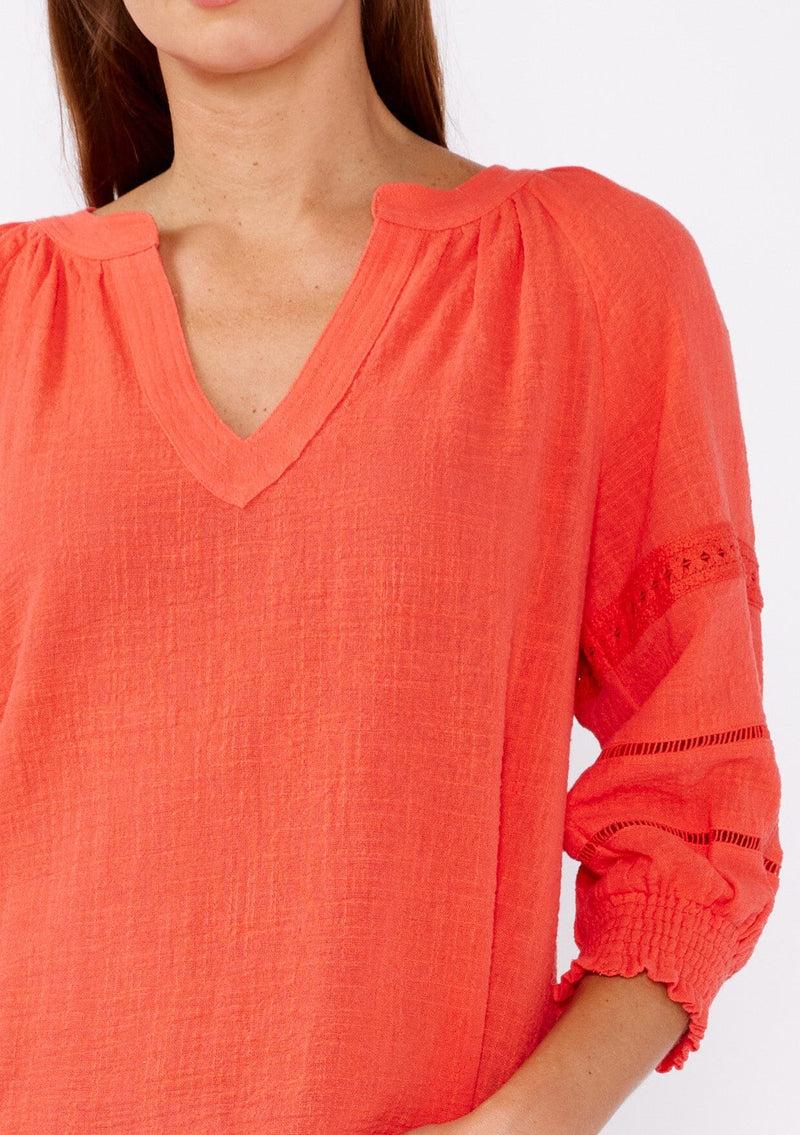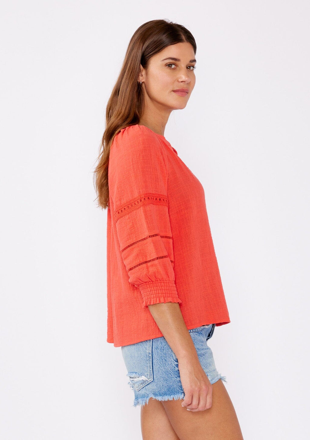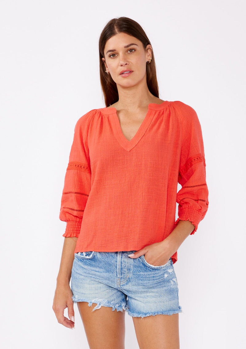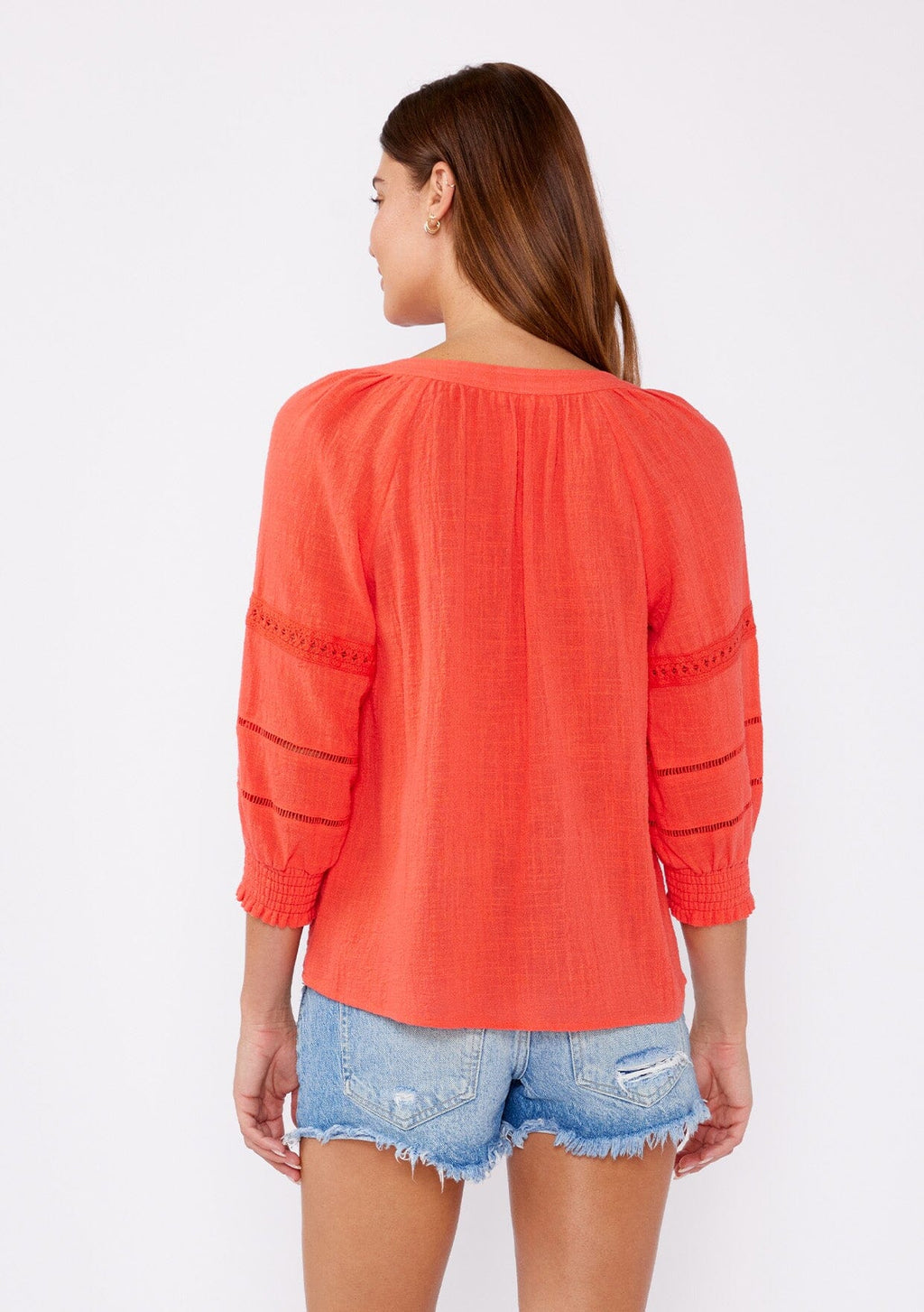 Crafted from textured cotton, this blouse offers a relaxed fit with a touch of sophistication. Featuring a split v-neckline for a timeless appeal and 3/4 length sleeves with smocked cuffs. Delicate lace trim inserts enhance the femininity of this classic blouse and adds a bohemian touch for effortless styling. We love to style it with our favorite vintage denim or cut off shorts for the summer.