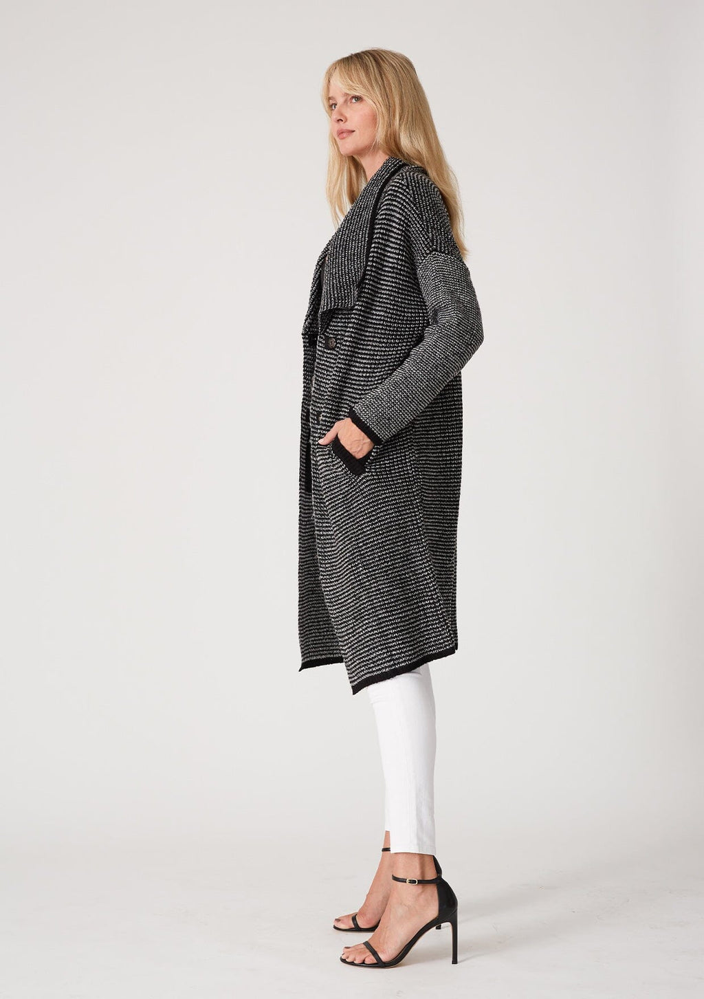 An oversized collar adds interest to this classic duster cardigan. Designed in a cozy black and white knit, with a snap button front, side pockets, and contrast black trim. An essential fall style.