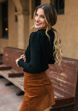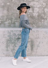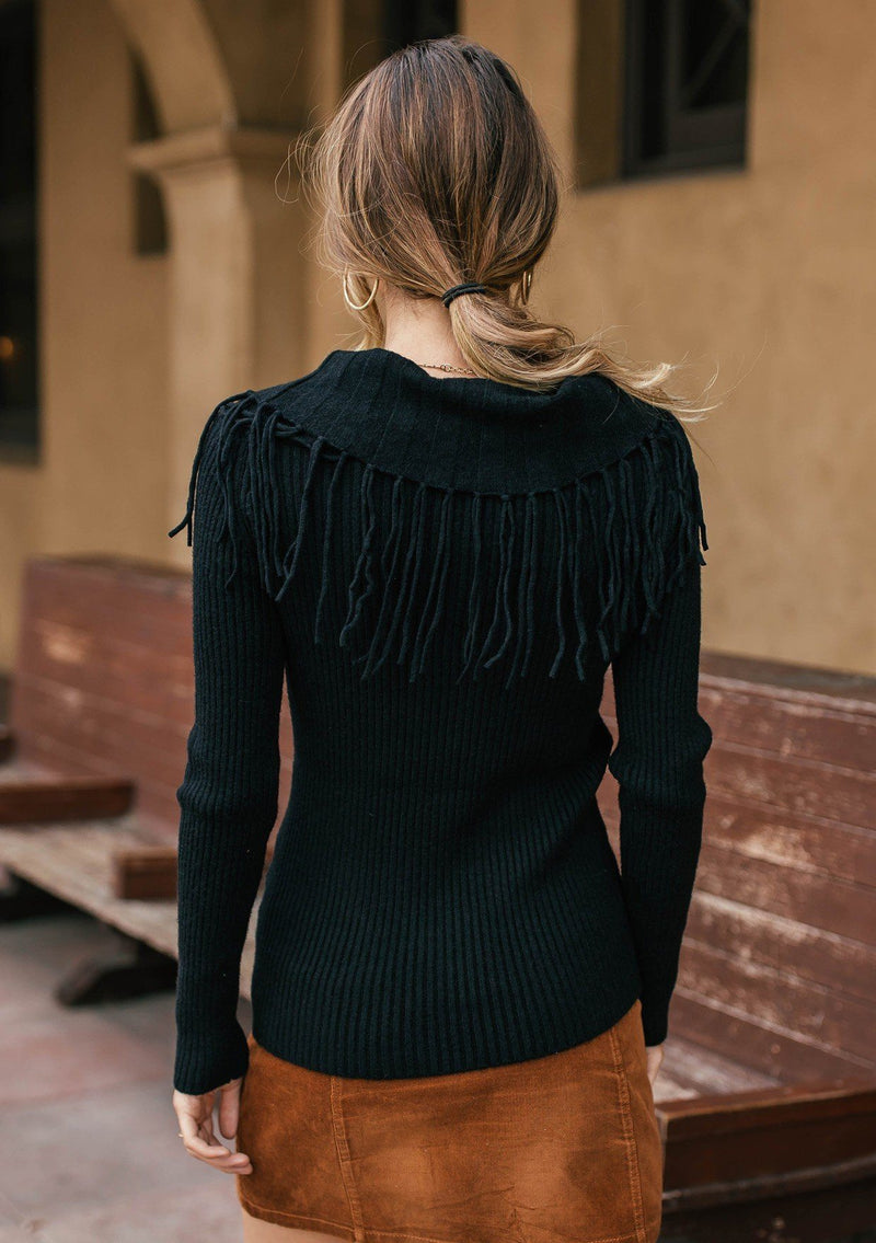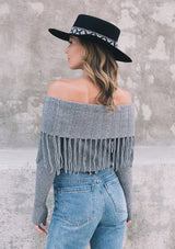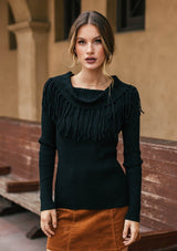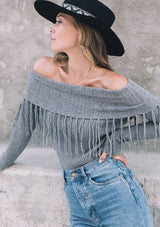 Shop NowWorn off the shoulder or loose around the neck, our ribbed knit sweater will add a cool touch to whatever you're wearing. Featuring a versatile boat neckline and a whimsical fringed trim. Pair it with denim for a casual everyday look, or throw it on with a skirt and western boots for a chic Fall vibe.
